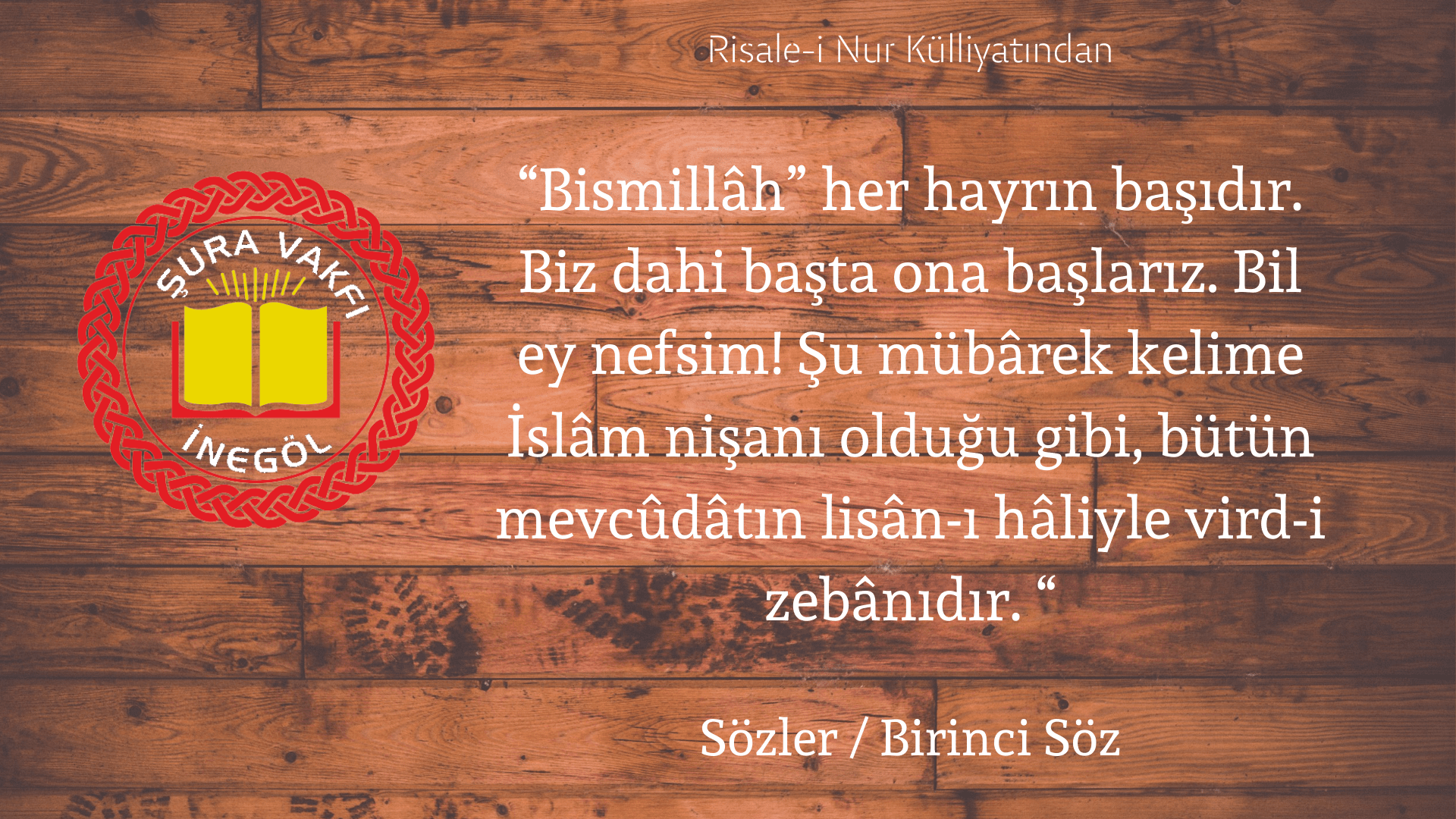“ Bismillâh” her hayrın başıdır. Biz dahi başta ona başlarız. Bil ey nefsim! Şu mübârek kelime İslâm nişanı olduğu gibi, bütün mevcûdâtın lisân-ı hâliyle vird-i zebânıdır. “